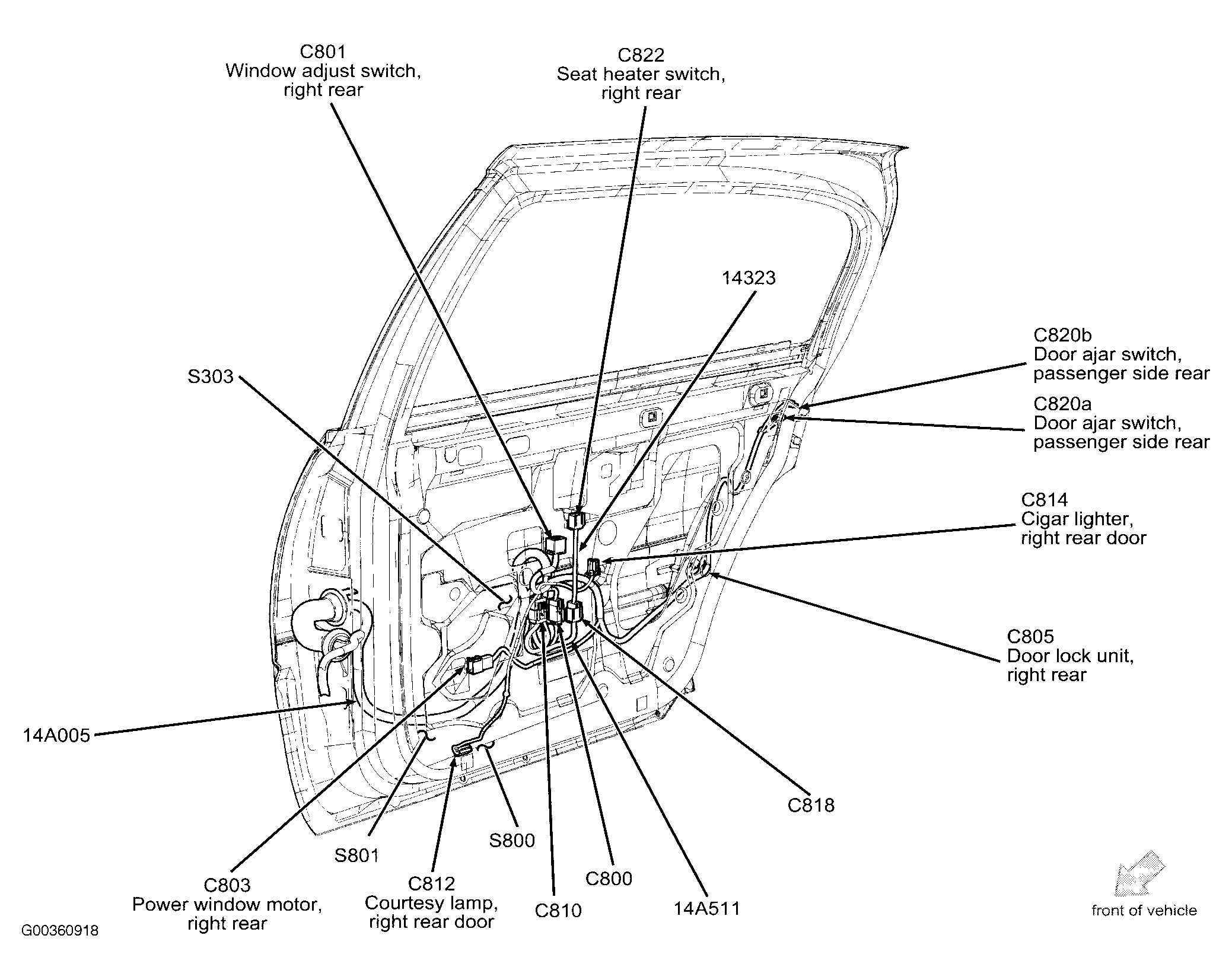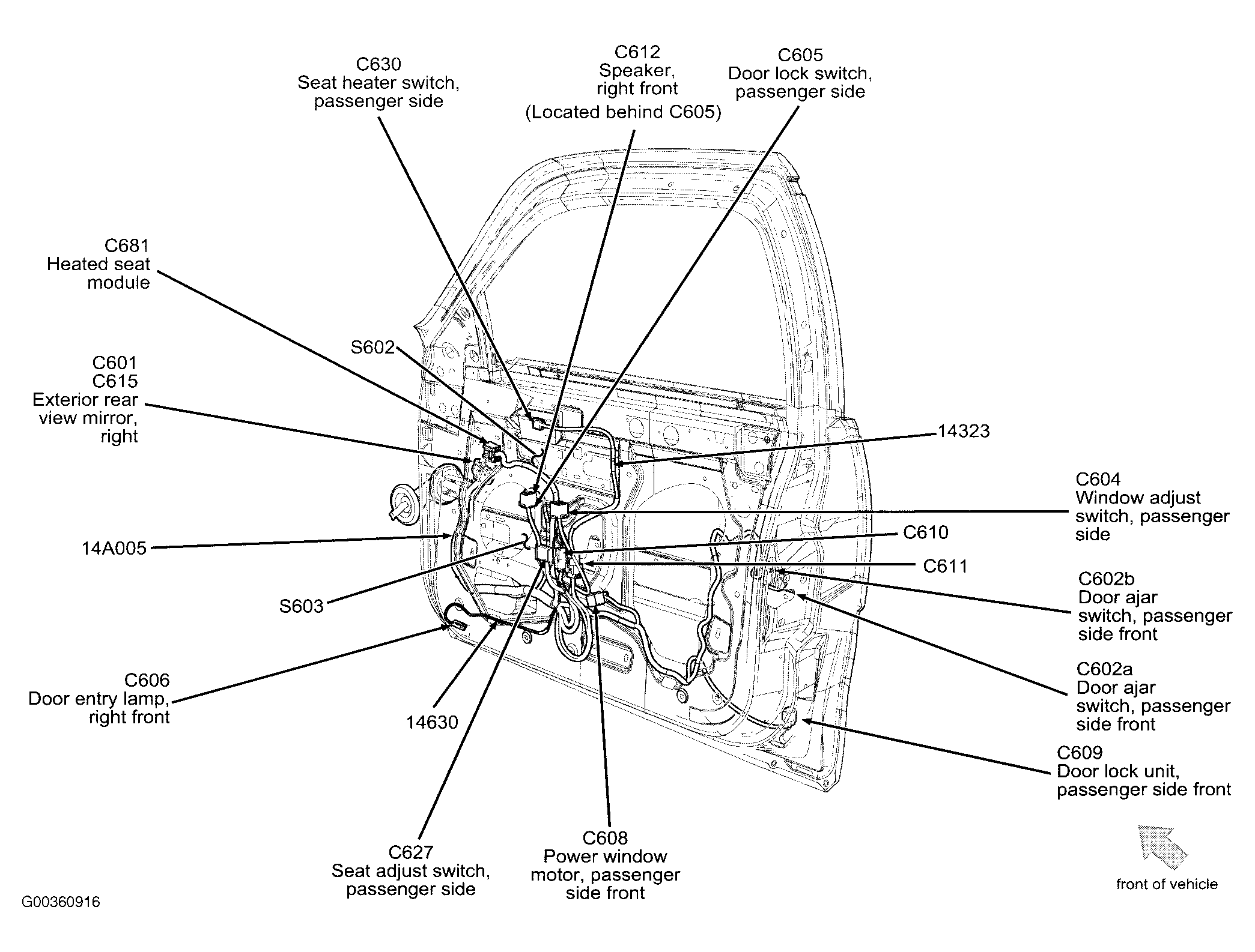 | Door Lock Unit, Passenger Side Front | Bottom rear of right front door. See Figure . |