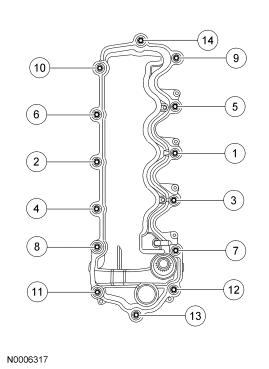 - Tighten the engine front cover fasteners in sequence in 2 stages.
