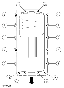- Install the oil pan gasket and the oil pan and loosely install the bolts.