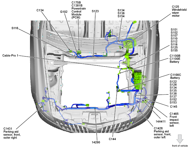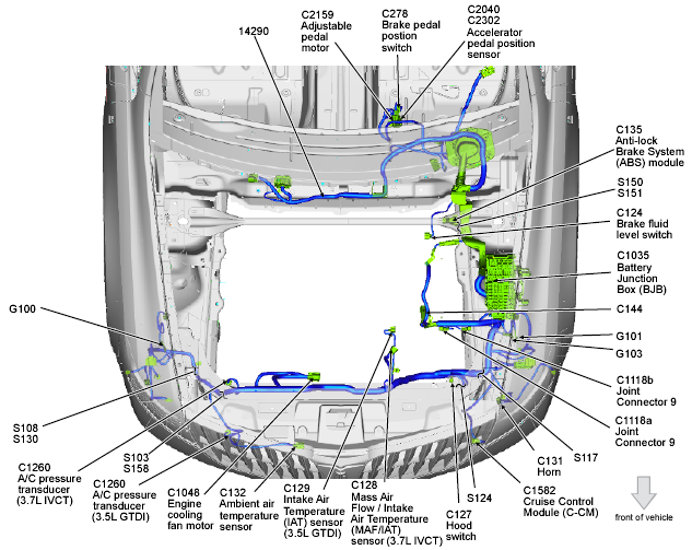 | Cruise Control Module (C-CM) | Left front corner of engine compartment. See Figure. |