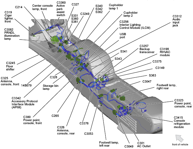 | Interior Lighting Control Module (ILCM) | Under center console. See Figure. |