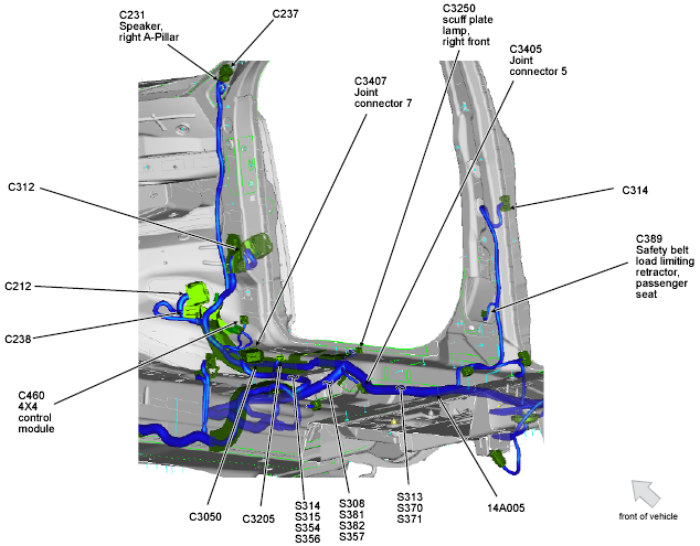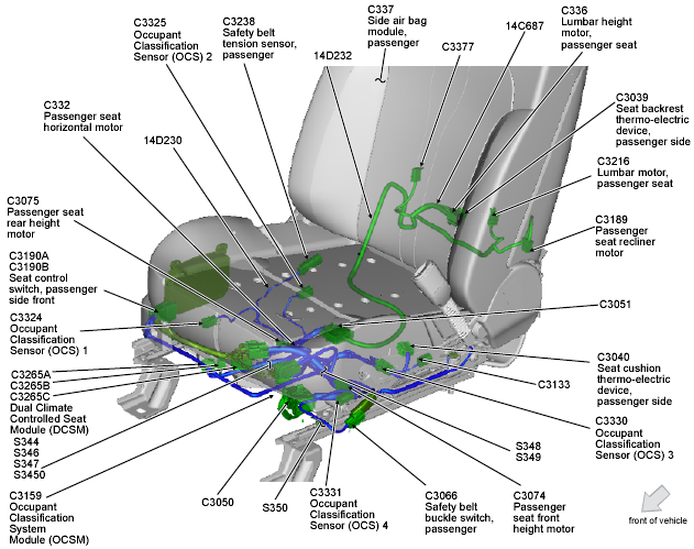 | Occupant Classification System Module (OCSM) | Under front passenger's seat. See Figure. |