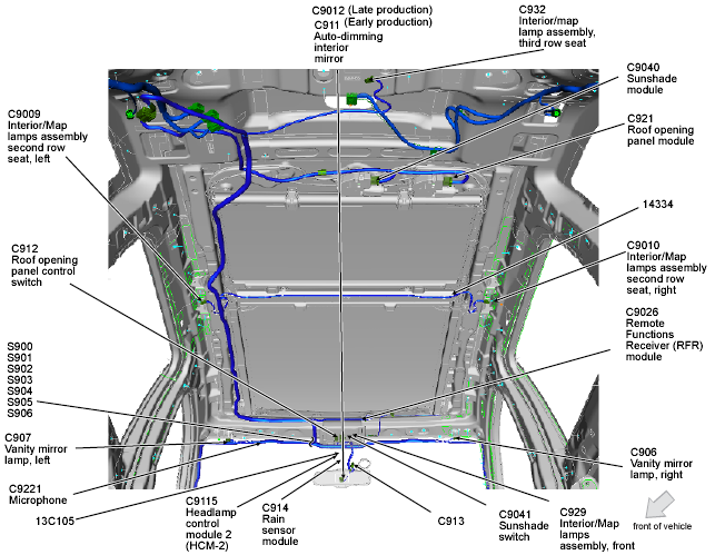 | Headlamp Control Module 2 (HCM-2) | Center front of roof. See Figure. |