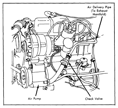 The belt-driven air pump supplies air under pressure through the one-way check valve to a single entry point in the exhaust manifold. The air combines with exhaust gases to continue the oxidation process in the exhaust system. The one-way check valve prevents reverse flow in the air injection system when exhaust gas pressure exceeds air pump pressure. A relief valve is attached to the air pump to relieve excess pump pressure at high engine speeds. See Fig 1.