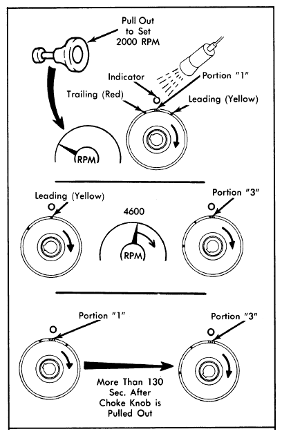 - Increase engine speed with throttle and check that timing advances and lines up with indicator when engine speed increases to more than 4600 RPM. After 130 seconds and after pulling choke knob out, portion "1" should advance quickly and portion "3" should take its place.
