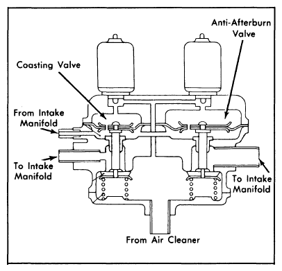 - Disconnect hose from air cleaner-to-coasting valve and plug vacuum port of deceleration control valve. With engine at idle, disconnect solenoid wire from anti-afterburn valve. Hold hand over suction hose of anti-afterburn valve, no suction should be felt.