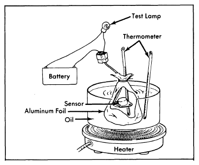 Remove sensor from floorboard. Wrap a thermometer and sensor with aluminum foil and place in an oil bath. See Fig 1. Connect test lamp and battery to sensor coupler terminals. Gradually heat oil. Test lamp should come on when temperature in aluminum foil reached 284-320°F (140-160°C). If sensor does not operate within specifications, replace sensor assembly.