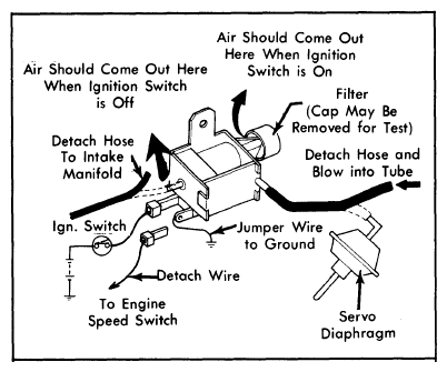 - Remove vacuum sensing tube from servo diaphragm. Remove intake manifold vacuum tube from 3-way solenoid. Detach wire from 3-way solenoid which comes from engine speed switch. Ground 3-way solenoid at disconnected terminal using jumper wire.