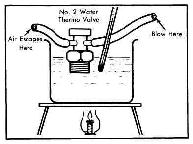Drain radiator until coolant level is below inlet manifold. Remove hoses from thermo valve and remove valve from inlet manifold. Connect hoses to valve and place valve in container of water with thermometer. Gradually heat water and note temperature at which air will not pass through valve. See Fig 1. If air passes through valve before temperature shown in Thermo Valve/Switch Specifications table, replace No. 2 water thermo valve.