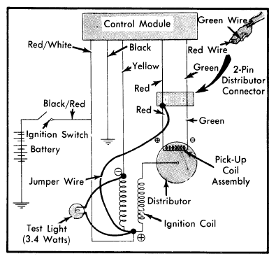 - Connect a test light (3.4 watts) to the ignition coil positive and negative terminals. See Fig 1. Attach one end of jumper wire to positive terminal of ignition coil. Disconnect the 2-pin connector.