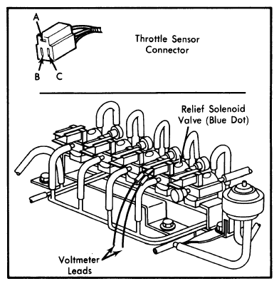 - Warm engine to normal operating temperature. Connect tachometer to engine. Connect voltmeter to relief solenoid valve connector terminals. Disconnect connector from throttle sensor and connect a jumper wire between terminals "A" and "C" of connector. See Fig 1.
