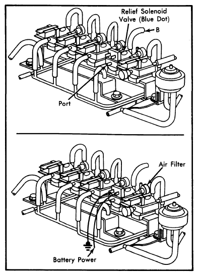 2. Disconnect electrical connector from relief solenoid valve and connect battery power to solenoid terminals. Blow through vacuum hose again. Air should pass through valve and escape through air filter. If valve does not respond as described, replace relief solenoid valve.