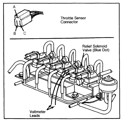 1. Warm engine to normal operating temperature. Connect tachometer to engine. Connect voltmeter to relief solenoid valve connector terminals.