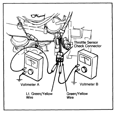 - Using 2 voltmeters, connect positive lead of one voltmeter to Light Green/Yellow wire terminal of throttle sensor check connector. Connect positive lead of other voltmeter to Green/Yellow wire terminal of throttle sensor connector. Connect negative terminals of both voltmeters to good ground. See Fig 1.