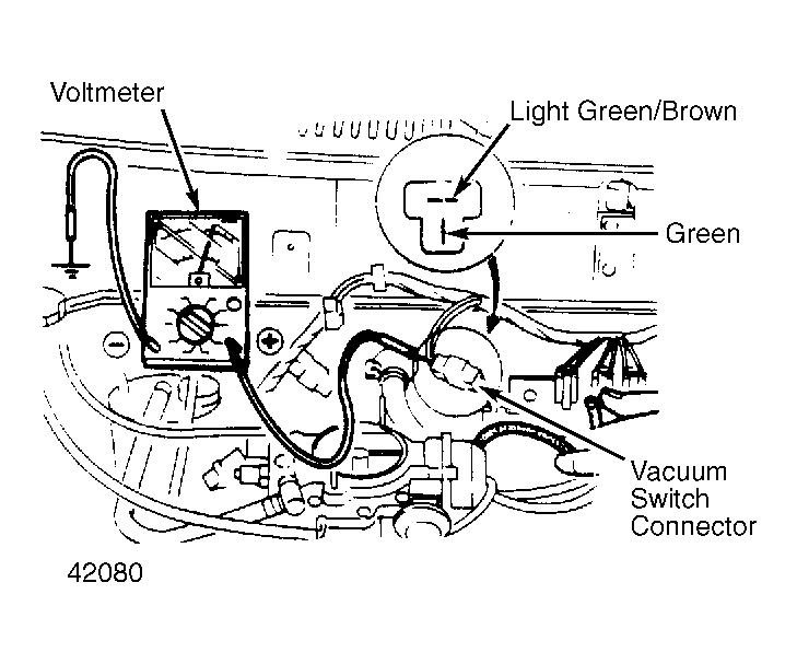 - Run the engine at idle. Connect a voltmeter to the vacuum switch connector Green terminal. Voltmeter should read below 1.5V. Disconnect and plug vacuum sensing tube from the vacuum switch. Voltmeter should read 12V. See Fig 1 .