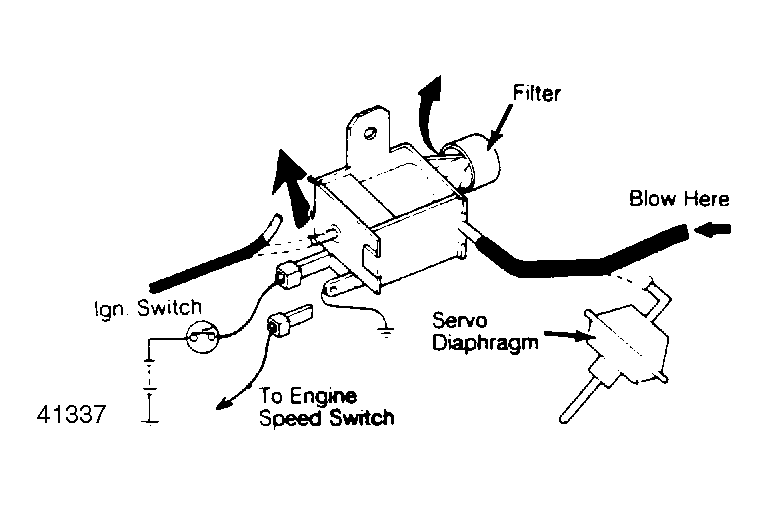 4. Disconnect 12V from solenoid valve. Air blown through the solenoid valve-to-servo diaphragm hose should now come out of the intake manifold port. See Fig 1 .