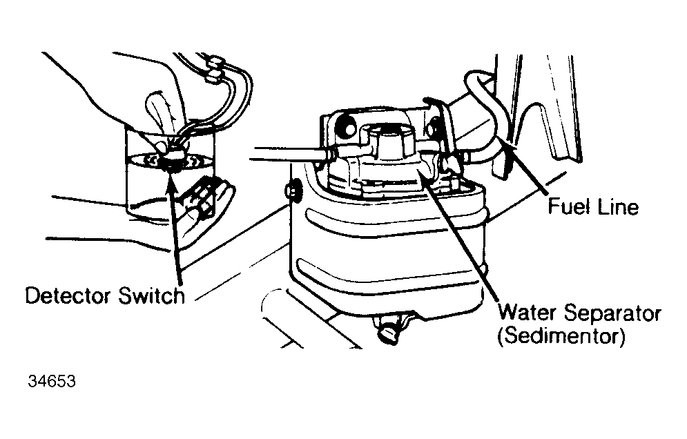 Remove the water detector switch from the top of the water separator. Disconnect detector switch wires from harness. Connect an ohmmeter to water detector switch. The detector is operating properly when continuity exists with switch upright and no continuity exists with switch upside down. See Fig 1 .
