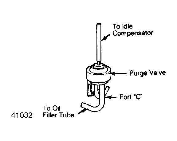 1. Disconnect purge valve-to-oil filler tube hose from purge valve. Start engine and operate at idle speed. Place finger over port "C" and check that air is not being drawn into port. See Figure .