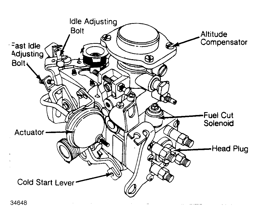 The injection pump is a vane type pump and is driven by the engine timing gears. An altitude compensator and a cold start device are installed on the pump to modify injection duration as necessary. The distributor portion of the pump contains a fuel cut solenoid to stop fuel flow to the injectors after the ignition switch is turned off. See Fig 1 .