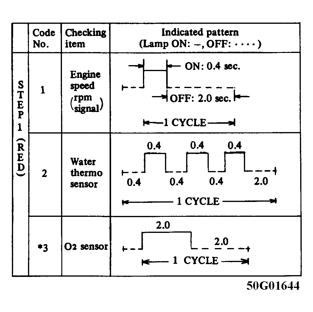 NOTE: For Code Number 3 in Fig 1 below, if the trouble have been found, do not turn off the ignition switch. If it is turned off, O2 sensor cannot be checked with the system checker.