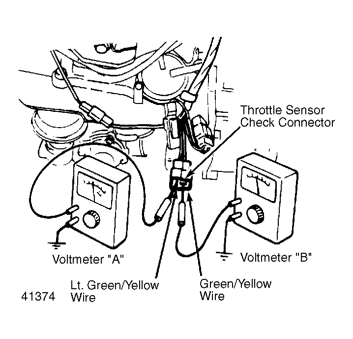 - Using 2 voltmeters, connect positive lead of one voltmeter to Light Green/Yellow wire terminal of throttle sensor check connector.