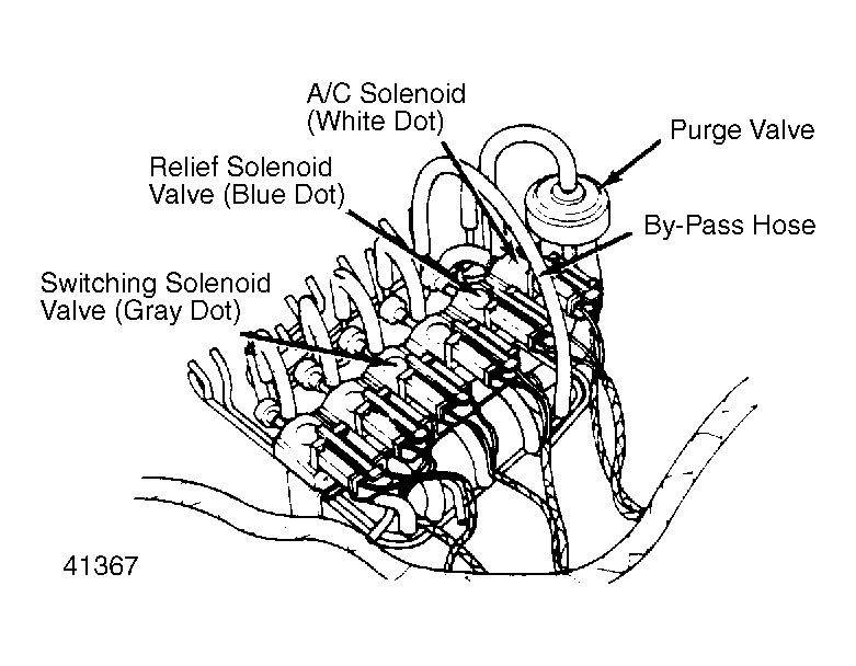 5. Reconnect by-pass hose at relief solenoid valve. Using throttle, set engine speed at 2500 RPM. Disconnect vacuum sensing tube from switching solenoid valve (Gray color dot).