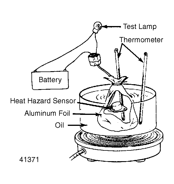 - Connect a battery and test lamp to sensor connector. Test lamp should glow. Gradually heat oil. Test lamp should go OFF when temperature inside aluminum foil is 248-284°F (120-140°C). If sensor does not respond as outlined, replace heat hazard sensor.