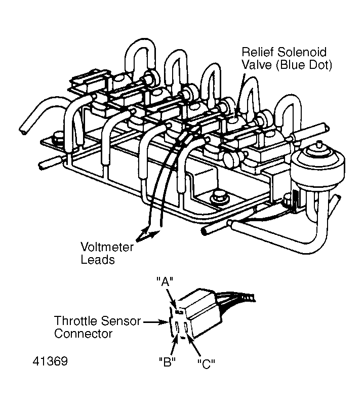 1. Warm engine to normal operating temperature. Connect tachometer to engine. Connect voltmeter to relief solenoid valve connector terminals.