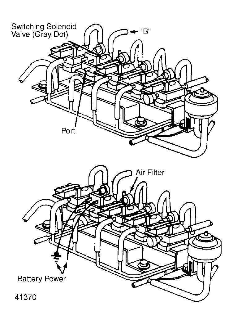 - Blow through hose again; air should pass through valve and escape through filter at rear of valve. If switching valve does not respond as described, replace switching solenoid valve.