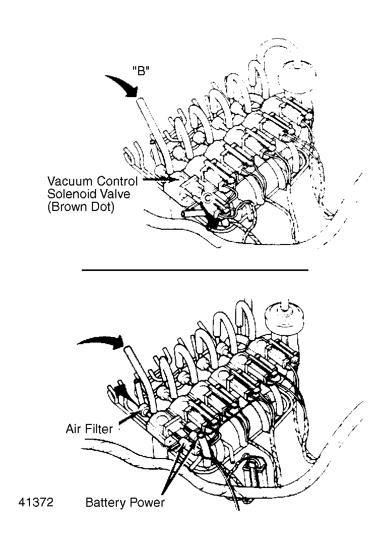 1. Disconnect vacuum sensing tubes from leading vacuum control solenoid valve (Brown dot). Blow through solenoid valve from vacuum tube "B" shown in Figure . Air should escape at front port. Trailing vacuum control solenoid valve (Green dot) is tested in the same manner.