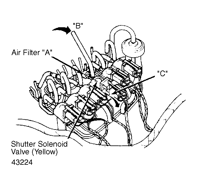 1. Disconnect vacuum sensing tubes from shutter solenoid valve (Yellow color dot). Blow through solenoid valve through vacuum hose "B" shown in Fig 1 ;. Make sure air passes through the valve and comes out port "C".