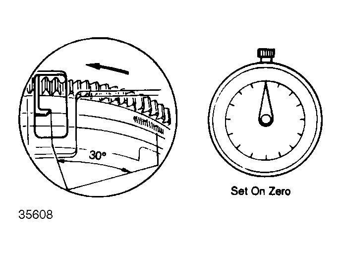 3. Turn flywheel counterclockwise until timing mark on crankshaft pulley moves from TDC to 30-50° counterclockwise of TDC. See Fig 2 . Set dial indicator to zero. Now turn flywheel clockwise to align TDC timing mark on flywheel with indicator pin. If properly timed, dial indicator should read .0392-0408" (.98-1.02 mm).