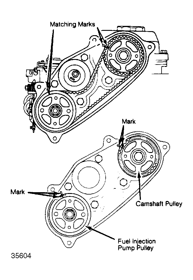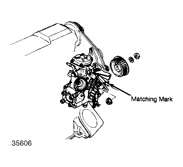 - Install pump pulley to injection pump shaft and align match marks. Hold pulley with 2 bolts and tighten lock nut to 43-51 ft. lbs. (60-70 N.m). Turn crankshaft to align match mark of camshaft pulley with mark on rear seal cover. See Figure . Loosen bolt tensioner lock nut, turn tensioner clockwise as far as possible and temporarily tighten lock nut.