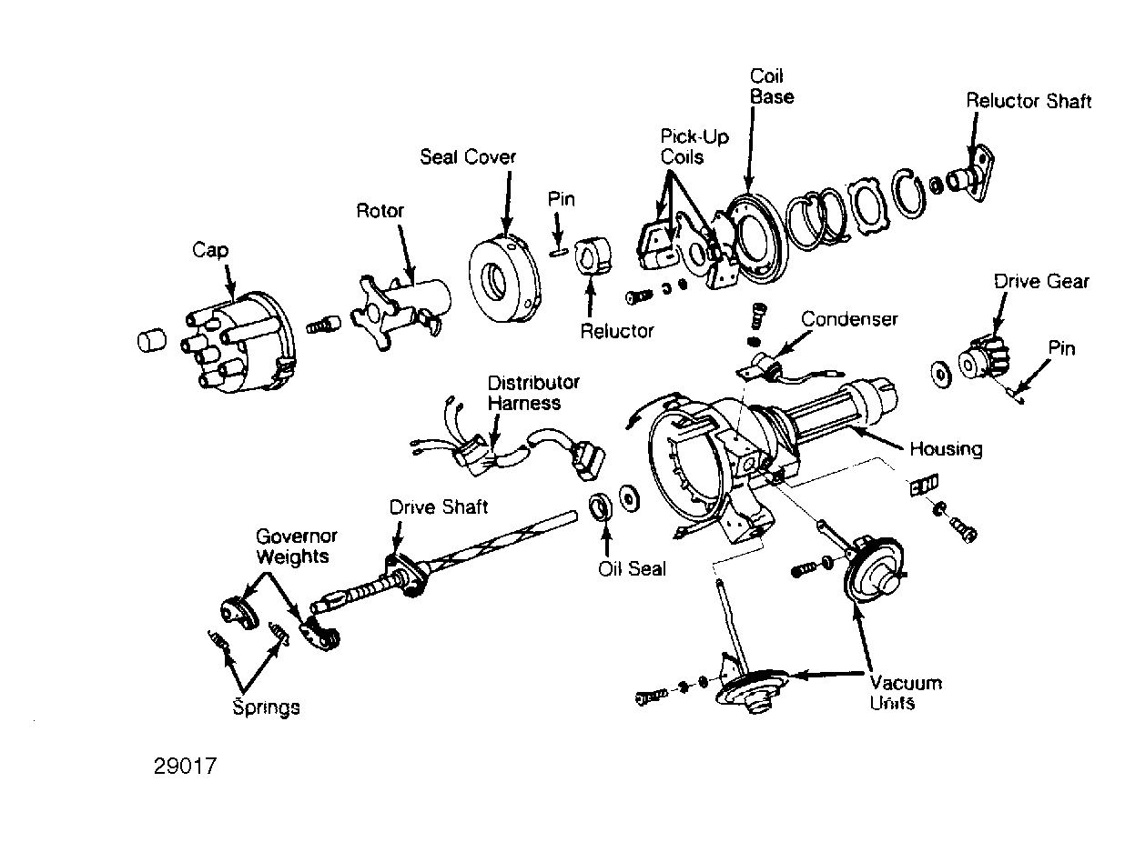 - Remove reluctor from reluctor shaft using puller. Remove spring pin. Remove governors by removing springs. Drive lock pin out of drive gear using a small drift. Remove gear and washers. Remove drive shaft through top of distributor housing.