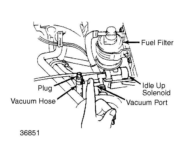 Bring engine to normal operating temperature and run at idle. Disconnect neutral switch (M/T) or inhibitor switch (A/T), located on left side of transmission. Remove and plug vacuum hose at idle up solenoid for electrical load, located next to fuel filter. See Fig 1 . Increase engine speed to 3000 RPM. Decelerate and ensure that a vacuum is present at idle up solenoid port between 1500-2300 RPM. If vacuum is not present test idle up solenoid. See IDLE-UP SYSTEM in EXHAUST EMISSION SYSTEMS - PISTON ENGINE MODELS article.
