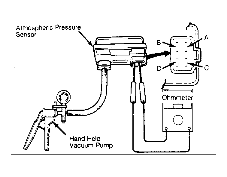 - Remove rubber cap from sensor. Attach hand-held vacuum pump to port on sensor. See Fig 1 . Turn ignition on and check voltage between each terminal and ground. See ATMOSPHERIC PRESSURE SENSOR SPECIFICATIONS table.