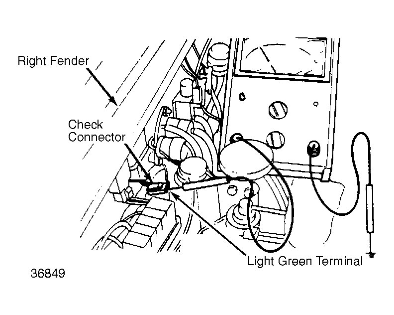 1. Bring engine to normal operating temperature and run at idle. Disconnect the neutral switch connector. Connect a voltmeter to the Light Green wire side of check terminal, located on the right fender. See Fig 1 .