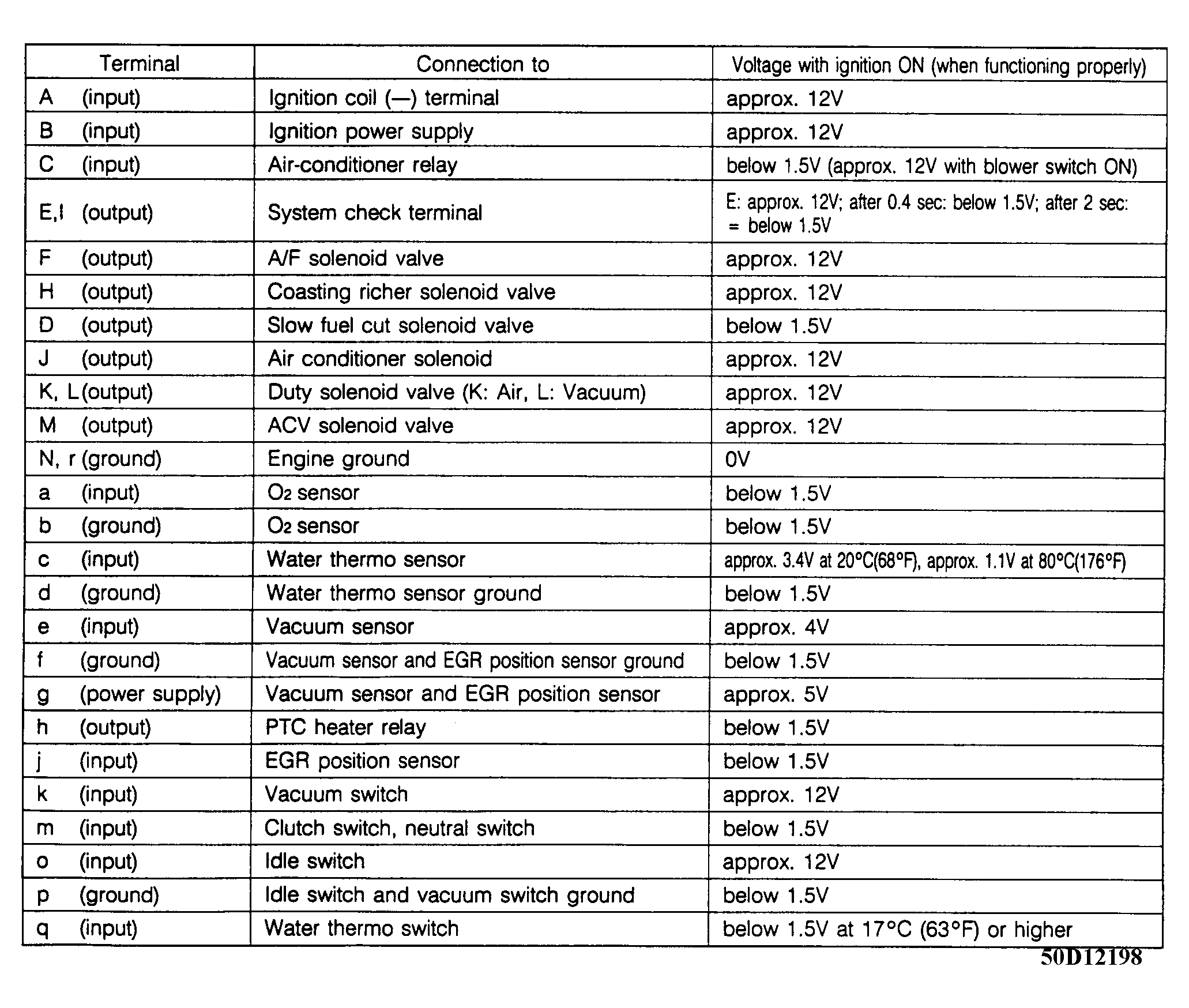 Connect multimeter or Megameter to control unit. See Figure for control unit location. Turn ignition on and measure voltage at each terminal. DO NOT start engine. See Fig 1 for terminal voltages. If voltages are okay, check related circuit for open or short. If voltages are not okay, replace control unit.