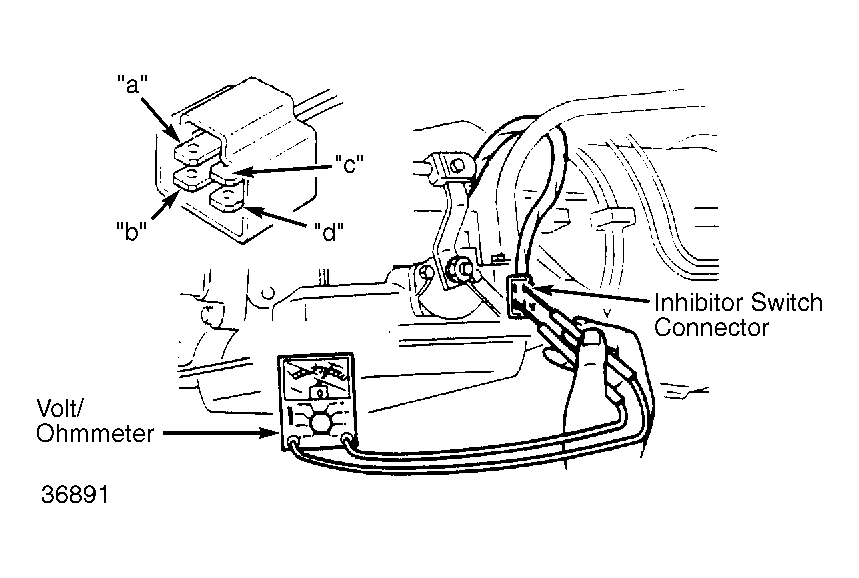 Disconnect inhibitor switch connector. Connect volt/ohmmeter to neutral switch, and then check continuity between switch. When transmission is in neutral or park, switch should be closed. When transmission is in gear, switch should be open. See Fig 1 .