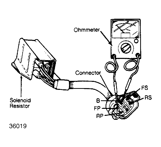 - Using an ohmmeter, check resistance between terminals "FP" and "B" of the solenoid resistor. See Fig 2