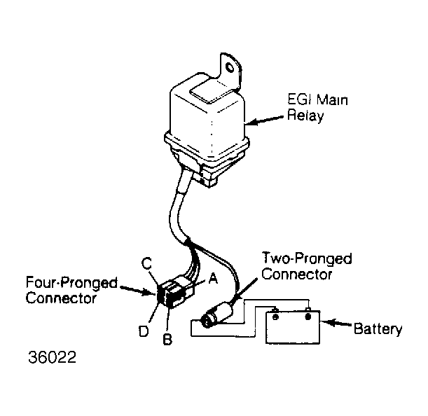 - If voltage is present at two pronged connector of the main relay, check continuity of main relay. Apply battery voltage and ground to the main relay side of the 2-pronged connector.