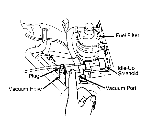 2. Increase engine speed to 3000 RPM. Decelerate and ensure that a vacuum is present at idle-up solenoid port between 1500-2300 RPM. If vacuum is not present, test idle-up solenoid.
