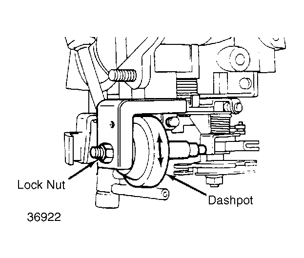 3. Increase engine speed to 3500 RPM. Slowly decrease engine speed checking that dashpot rod contacts lever at between 2700-3100 RPM. Adjust by loosening lock nut and turning dashpot. See Fig 1 .