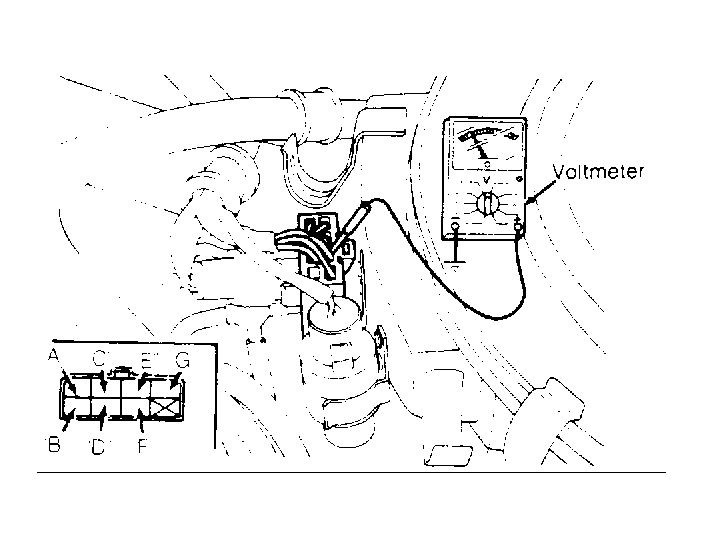 - Bring engine to normal operating temperature and run at idle. Connect a voltmeter to "E" terminal of solenoid valve connector. See Fig 1 .
