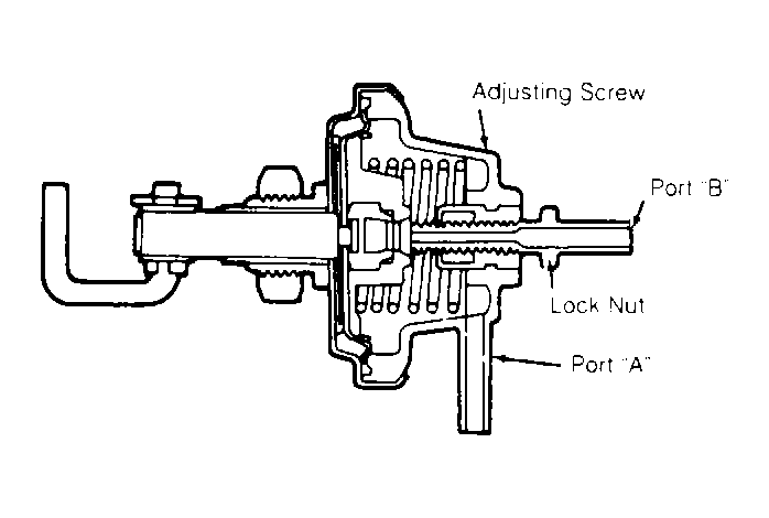 - Reconnect vacuum hose to port "A". Disconnect vacuum hose from port "B" and connect direct intake vacuum to port "B" and check idle RPM. Engine speed should be 920-970 RPM. If idle speed is not within specifications, adjust by turning adjusting screw on diaphragm. See Fig 1