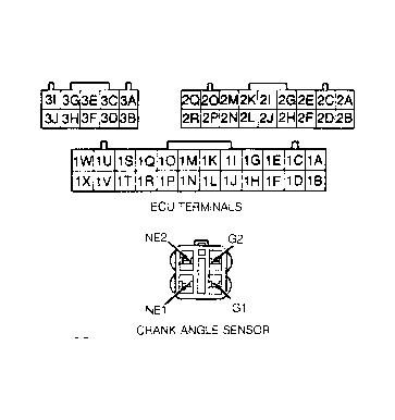 1. Remove sensor connector. Note terminal identification. See Figure . Using ohmmeter, check resistance at specified terminals. Resistance must be within specification. See CRANK ANGLE SENSOR RESISTANCE  table.