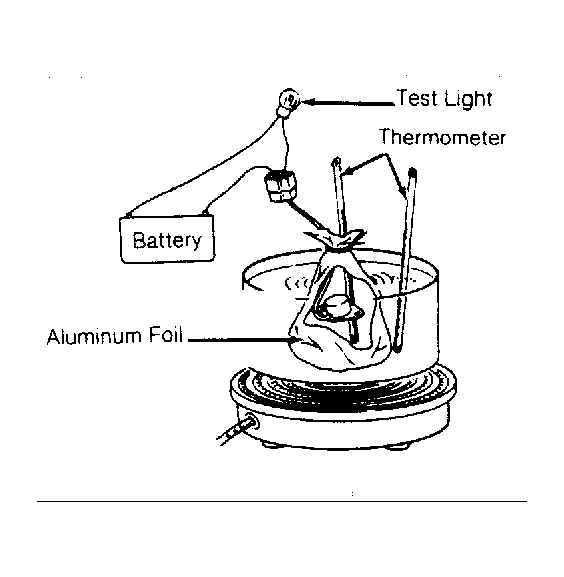 4. Connect test light and battery to sensor terminals. See Fig 1 . Heat oil and note temperature in the aluminum foil when the test light activates. Test light should activate when temperature reaches 221-239°F (105-115°C). Replace sensor if not within specification.