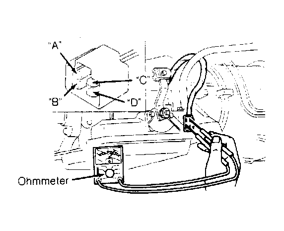 Remove connector from switch. Connect ohmmeter to switch terminals "C" and "D". See Fig 1 . Continuity should exist with gearshift in Park and Neutral. No continuity should exist in all other ranges.