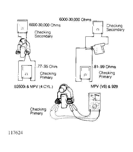 - Check secondary resistance between (positive) terminal and coil tower. See V6 IGNITION COIL RESISTANCE table. Replace coil if readings are not within specifications.