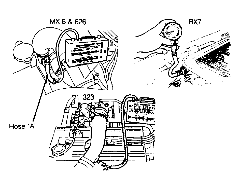 - Measure boost pressure while suddenly increasing engine speed. At approximately 4000 RPM boost should begin. Above approximately 5000 RPM pressure should be more than .07 psi (0.049 kg/cm2 ). If boost pressure is not within specification, proceed to following tests as necessary.